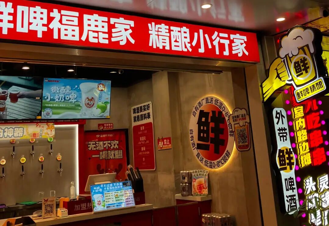 门店装修像极了雪王本王,常见的红白配色,只不过雪王换成小鹿,门头一打眼就是奶茶同款柜台,小酒馆们常见的昏暗灯光、读不通的文字组合变成了简单直接的“现打鲜啤 免费试喝”。