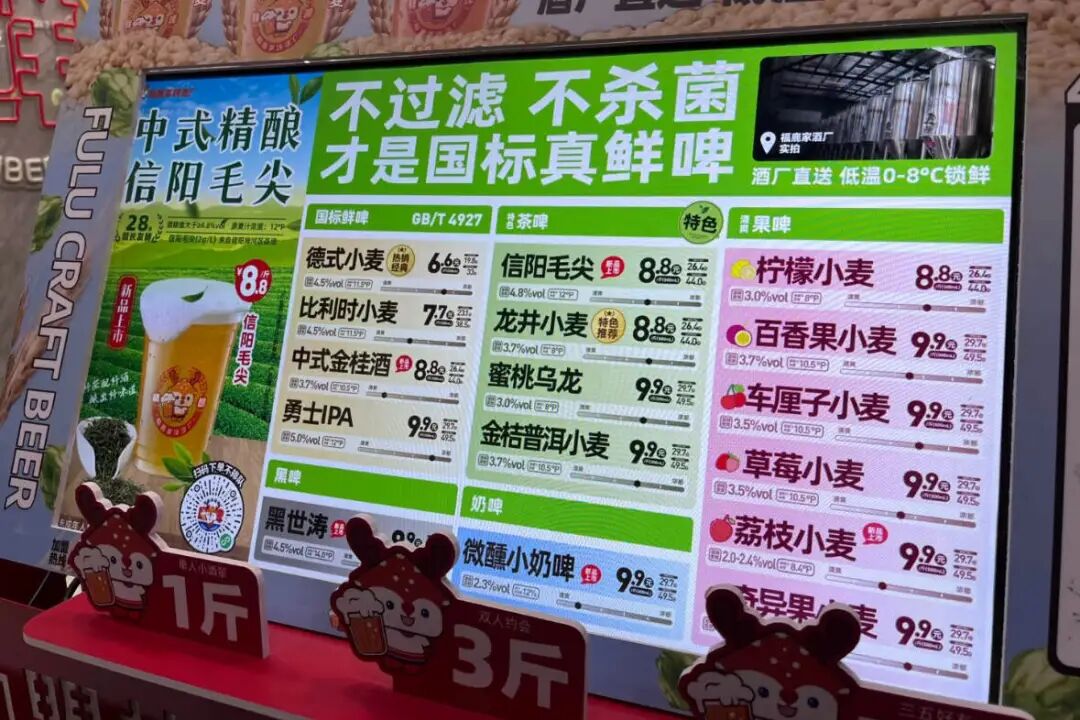 走进门店就能看到“鲜啤福鹿家 精酿小行家”的宣传语,精酿写在横幅上、杯子乃至袋子上,而现在,过去的精酿全部被鲜啤代替。
