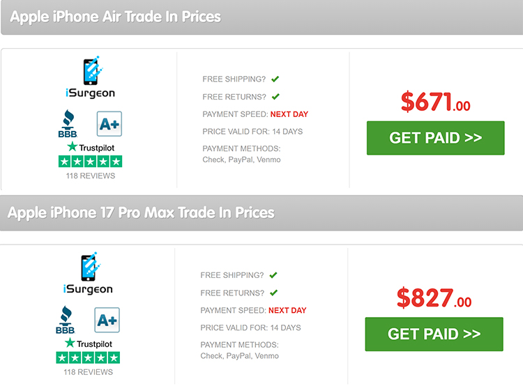 在美国的二手平台SellCell上,按照256GB、几乎全新、最高可用报价这3个共同搜索条件限定后,发现iPhone Air和Pro Max的降价幅度并没有拉开差距。