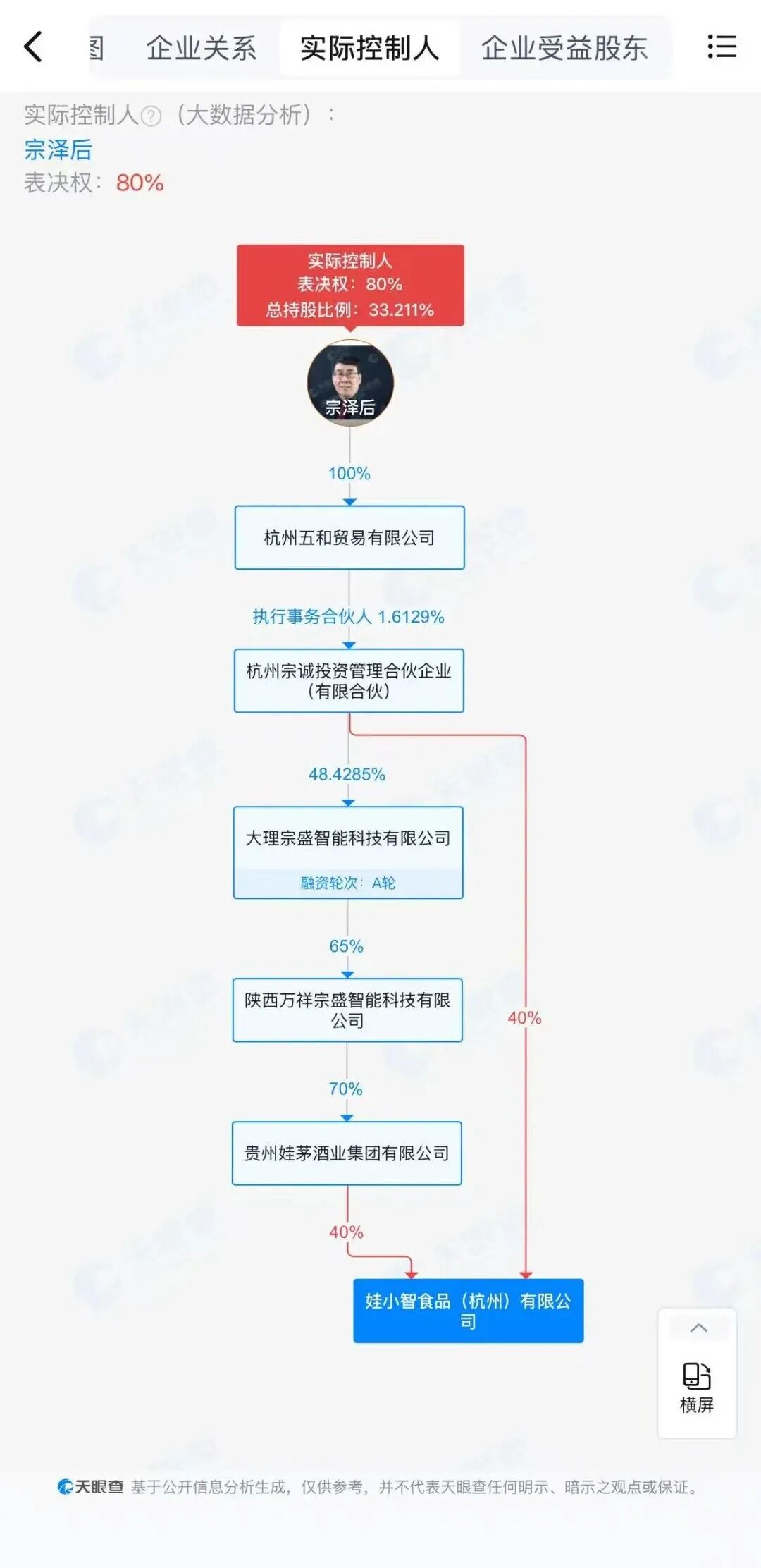 天眼查APP显示,娃小智食品(杭州)有限公司,成立于2025年,位于浙江省杭州市,是一家以从事批发业为主的企业。股权穿透后,宗泽后为该公司实际控制人。