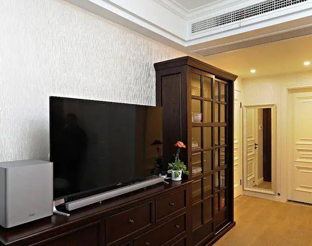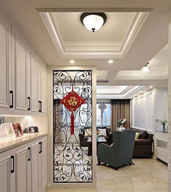 入户后有一排多功能柜子,为了保持客厅的私密性还特意安了一个镂空的装饰门做隔挡。