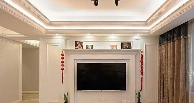 电视背景墙两边挂着灯笼和辣椒寓意生活红火,日子滋滋有味。