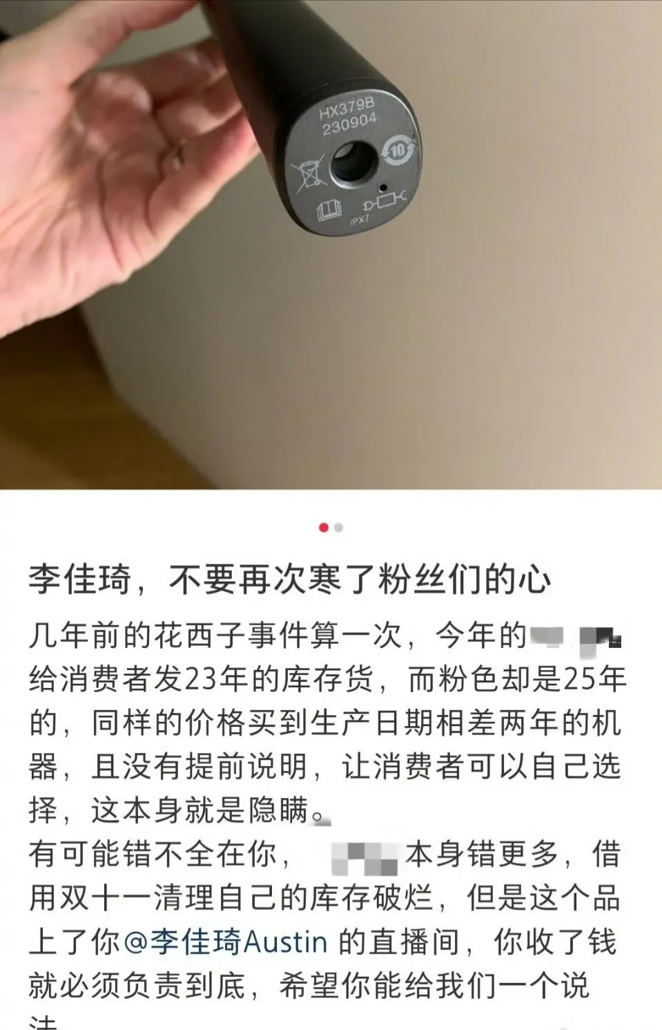 又如,有网友在网络上发文称,在李佳琦直播间购买的某品牌电动牙刷黑色款为2023年的库存货,另一款为2025年的。对于这种情况,李佳琦直播间没有提前说明,让消费者自己选择,本身就是隐瞒,即使错不全在李佳琦。