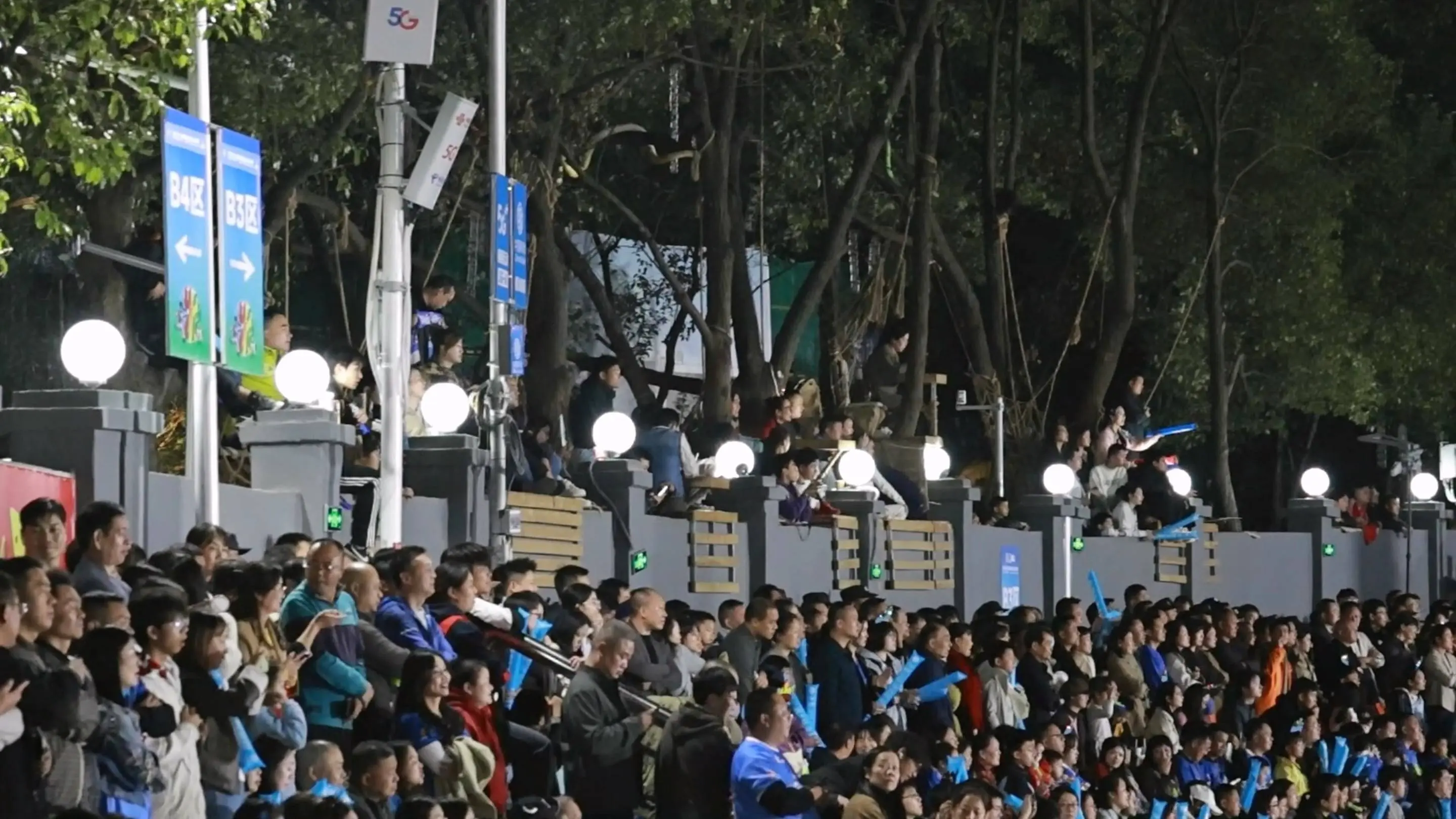 赛场内,特色观赛区域延续着永州温度。AB区域看台上,相亲专区的橙色座椅与加油横幅相映成趣,青年球迷们在进球欢呼的间隙礼貌互动,现场欢乐的氛围让社交变得温馨而自然。围墙外的树冠上,十余位持有 “挂票”的球迷正在主办方搭建的“特殊VIP座椅”上专注观赛,每隔几米就有一名安保人员实时守护;这种创新观赛方式,在规范管理下既保障了安全,又增添了观赛乐趣。看台上随处可见的文明观赛提示,与现场安保、志愿者的细致服务相配合,共同营造出理性文明的观赛氛围。