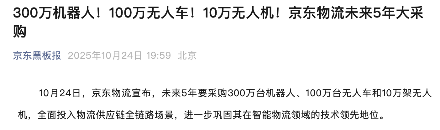 瑞财经 吴文婷 10月24日,京东物流宣布,未来5年要采购300万台机器人、100万台无人车和10万架无人机,全面投入物流供应链全链路场景,进一步巩固其在智能物流领域的技术领先地位。 据了解,今年京东11.11,京东物流