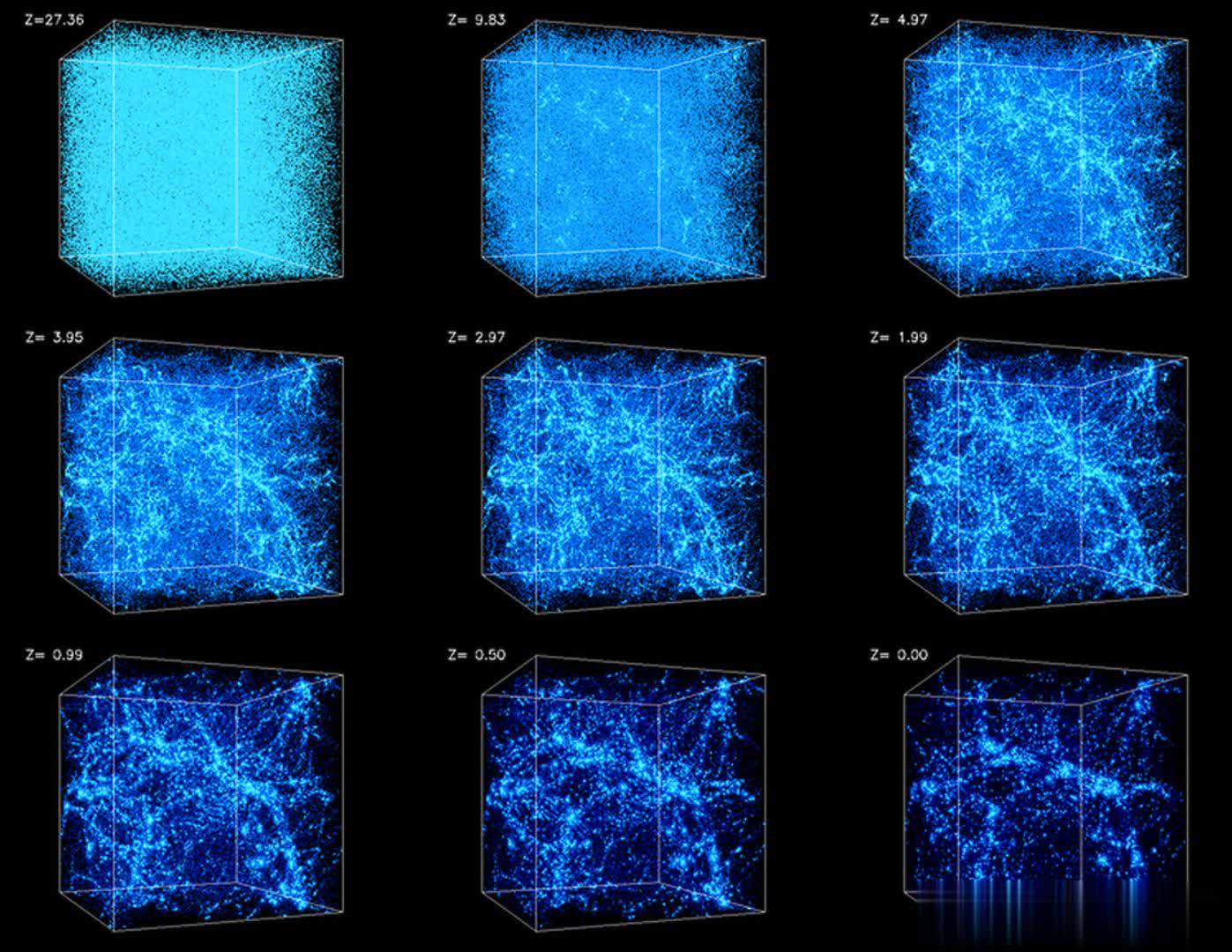 冷暗物质模式下星系团、大尺度纤维状结构与暗能量的构成图。本图显示了4,300万秒差距(1.4亿光年)范围内,红移值从30至现今的结构演化