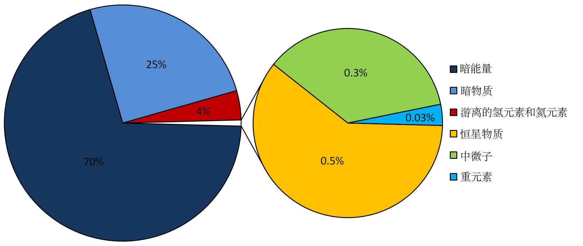 表示宇宙中不同能量密度组成比例的饼图,根据与观测最相符合的ΛCDM模型,有95%的成分都以充满奇异性质的暗物质和暗能量形式存在。