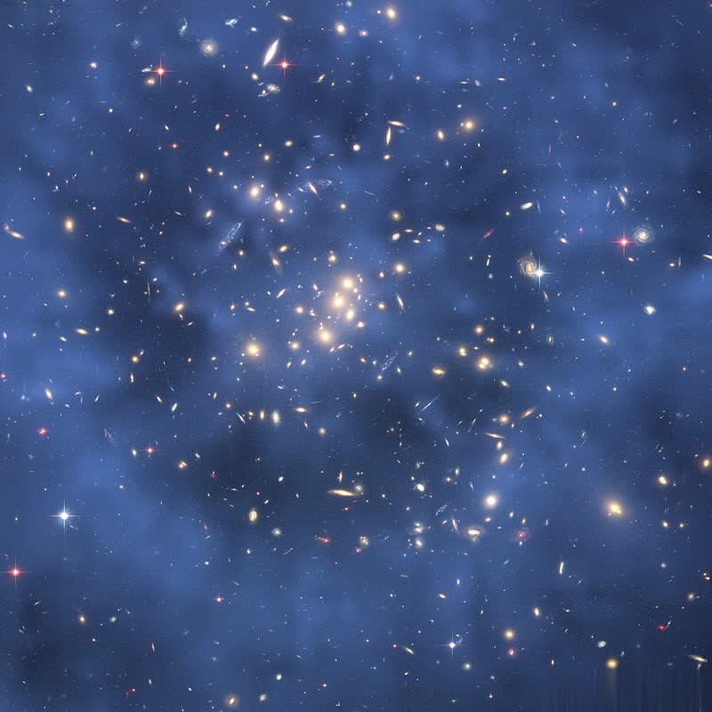 暗物质在这张哈勃望远镜 Cl0024+1654 星系团图像中表现为蓝光
