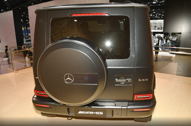 梅赛德斯-AMG G 63采用方盒子造型,方方正正的车身也是比较硬朗,轮胎的尺寸为295/40 R22,刹车卡钳采用红色涂装,排气在侧踏板下方,还是比较少见的,车尾的后挂式备胎也采用全尺寸,车身尺寸方面,长宽高分别为4871x1984x1984毫米,轴距为2890毫米。