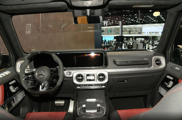 梅赛德斯-AMG G 63在内饰方面,同样没有什么变化,延续了老款车型的风格,内饰一些细节还提供金属装饰件和碳纤维饰件,方向盘采用双拼材质,全液晶仪表和中控屏幕的尺寸均为12.3英寸,相比老款车型,价格和配置都得到了调整。