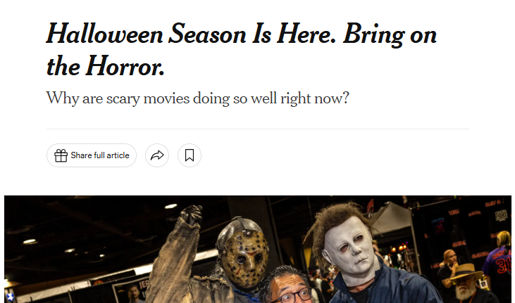 据《纽约时报》报道,过去十年间,恐怖片在美国市场的票房份额持续增长。今年,这一比例达到了新的高度——占美国总票房的17%,其份额已超过剧情片和喜剧片的总和。