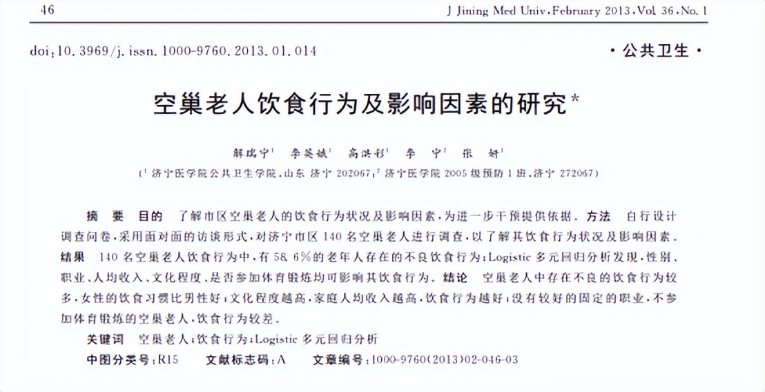 [1]解瑞宁,李英娥,高洪彩,等.空巢老人饮食行为及影响因素的研究[J].济宁医学院学报,2013,36(01):46-48.