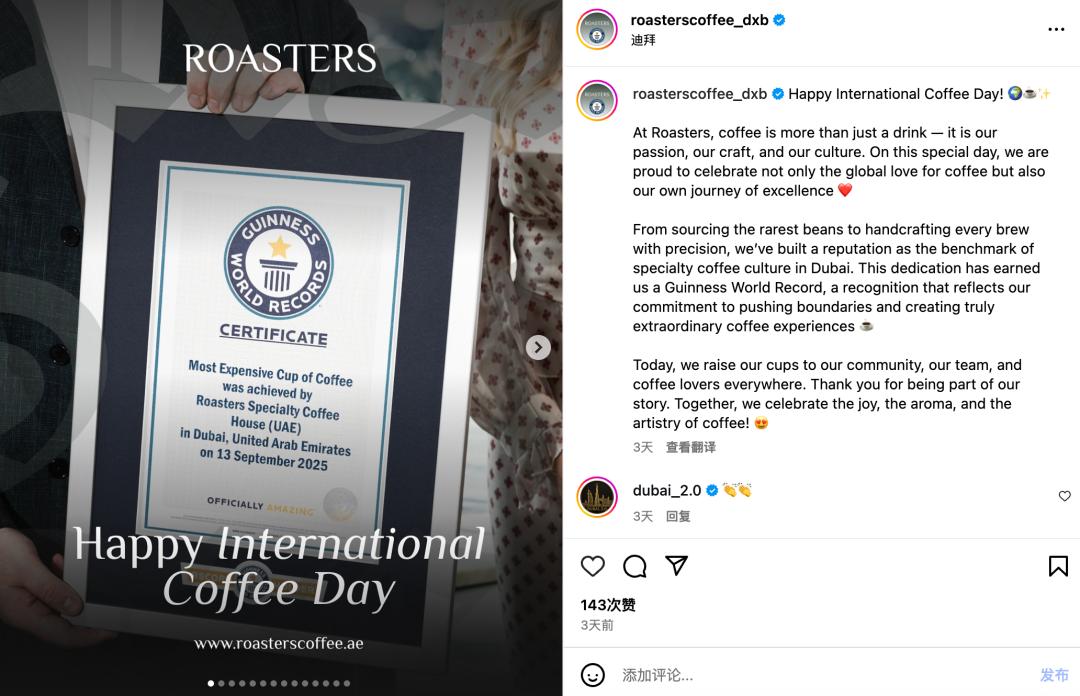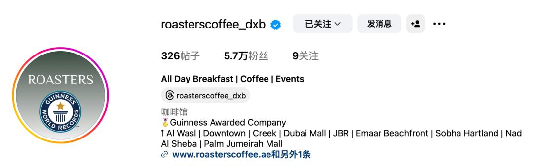 Roasters Specialty Coffee House在迪拜经营着12家豪华全天候餐厅,他们自身官方ins更是有数万粉丝,在独立烘焙商的角度来看,这已经算是大V了。他们官方账号除了会晒一些日常出品和店内推广宣传内容之外,也会无不透露着其高端的品牌属性,例如这种推窗就让迪拜地标哈利法塔尽收眼底的“低调炫富”,以及店内各种高端设备与硕大店面、优雅的装潢设计,都在为其品牌塑造出一种高端形象。