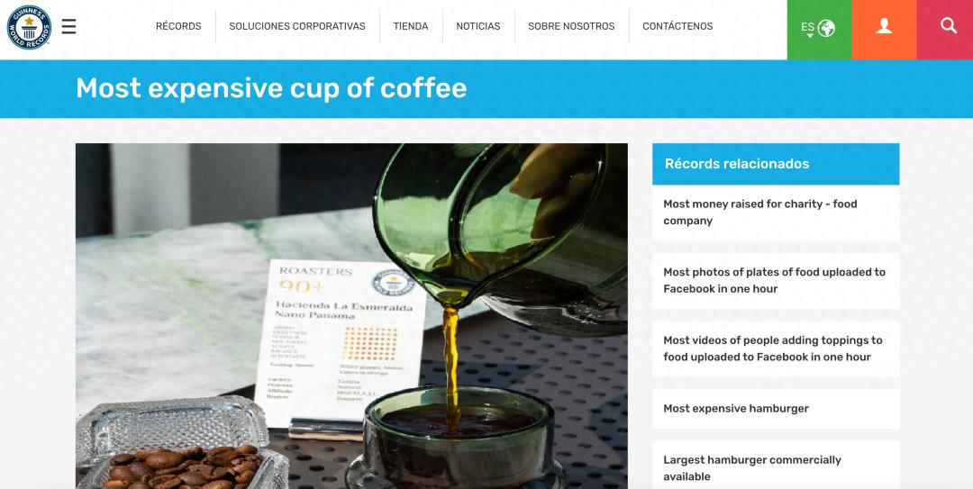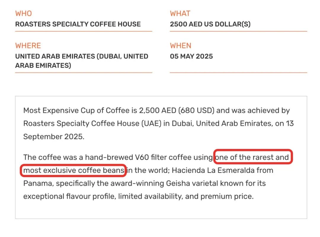 前阵子在吉尼斯世界纪录官网上搜寻一些关于咖啡的信息,发现就在今年9月份一家位于迪拜的Roasters Specialty Coffee House以每杯2500迪拉姆的价格出售世界上最昂贵的咖啡而上榜了吉尼斯世界纪录,这一杯相当于近5000块人民币的手冲咖啡所用的豆子正是来自大名鼎鼎的巴拿马翡翠庄园,在吉尼斯世界纪录的描述原文中,更是用到了one of the rarest and most exclusive coffee beans的最高级来形容这支豆子,说它是世界上最稀有、最独特的咖啡豆之一。