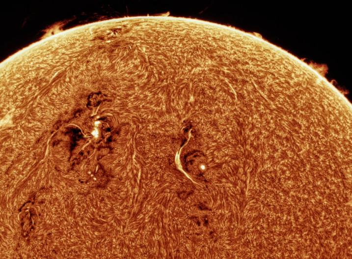 使用氢-α滤光片观测太阳时拍摄的画面,细节更为丰富。