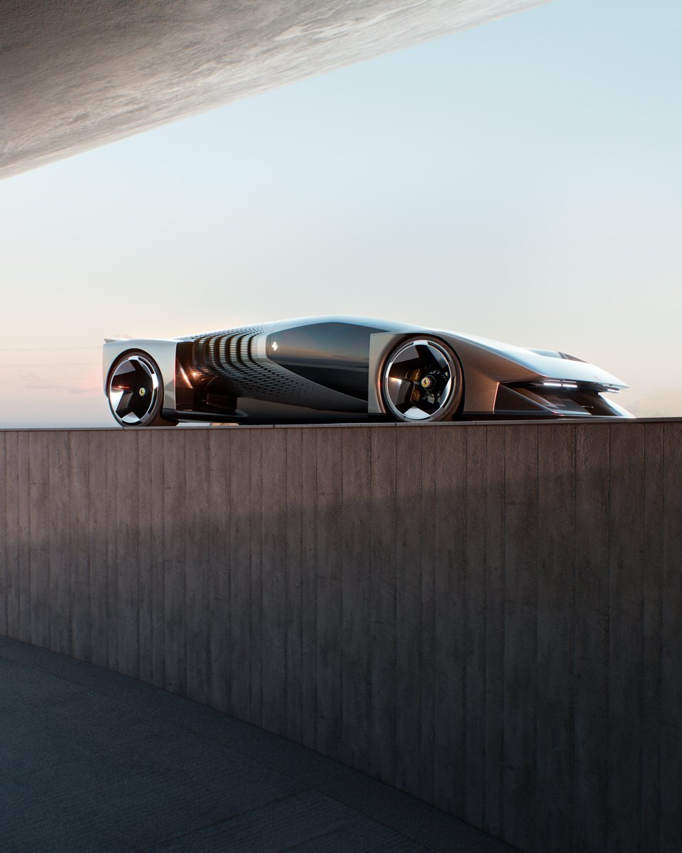 车头由悬于翼面之间的带状结构主导,将 F80 悬浮分流器概念发挥到极致。带状结构下方双舱俯冲至分流器,形成斜坡,强调中央通道入口及轮上侧向进气。悬带下的两对可收折前灯连接法拉利 70 至 80 年代的掀起式大灯传统与 F76 未来感,形成独特传统启发造型。