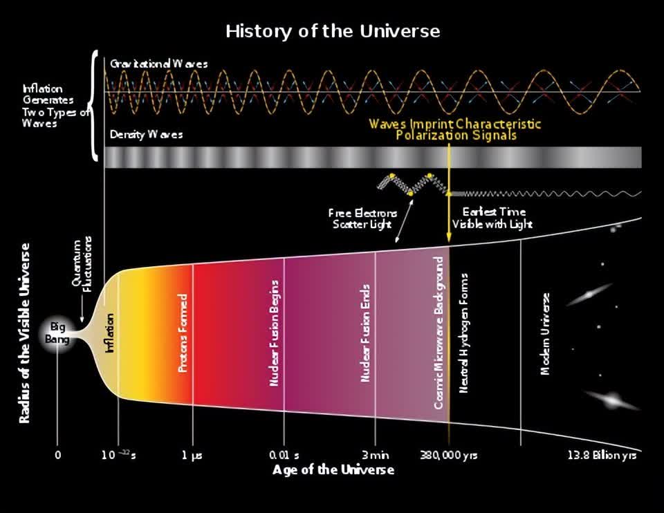 暴胀理论还预言了一些可以被观测到的效应,比如在微波背景辐射中产生特定模式的温度涨落,以及在原初引力波中产生特定模式的偏振信号。这些效应都是由于暴胀期间量子涨落被放大到宏观尺度所导致的。如果我们能够在微波背景辐射中检测到这些效应,那么就可以证实暴胀理论,并且推断出暴胀发生时的能量和时间。