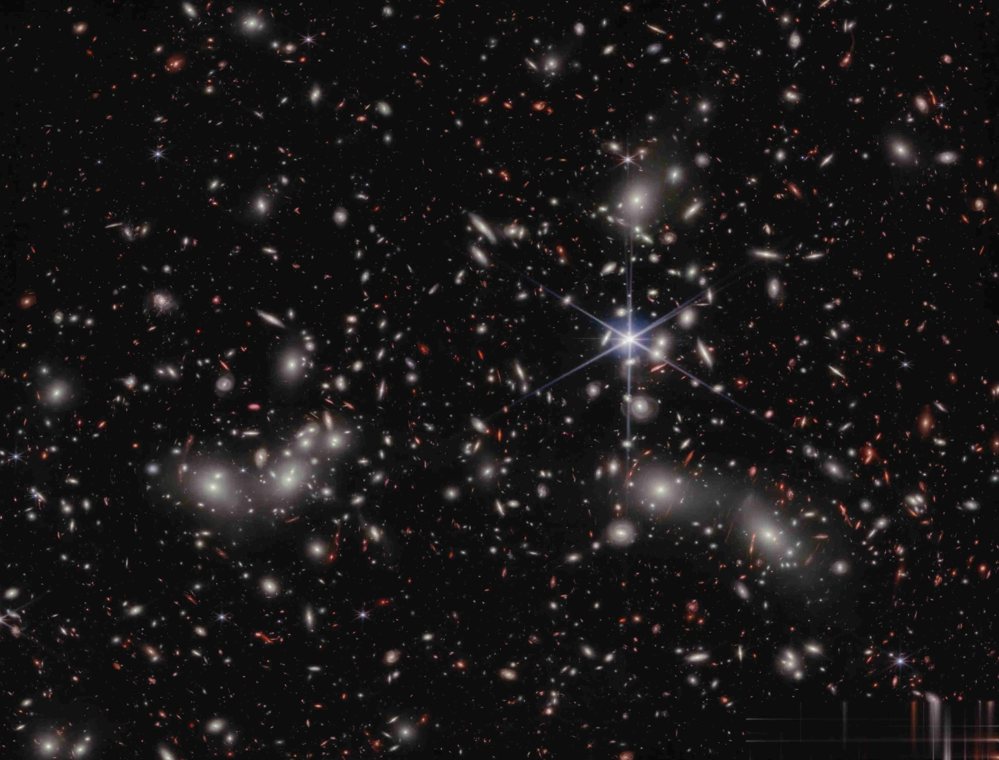 天文学家估计 NASA/ESA/CSA 詹姆斯·韦伯太空望远镜拍摄的这张图片代表了 50,000 个近红外光源。他们的光穿过不同的距离到达望远镜的探测器,在单个图像中代表了广阔的空间。我们银河系中的一颗前景恒星位于图像中心的右侧,显示出韦伯独特的衍射尖峰。被朦胧的辉光包围的明亮的白色光源是潘多拉星团的星系,这是一个由已经非常庞大的星系团聚集在一起形成一个巨型星团的星系。质量集中度如此之高,以至于时空结构因引力而扭曲,形成了一种天然的超放大镜,称为“引力透镜”
