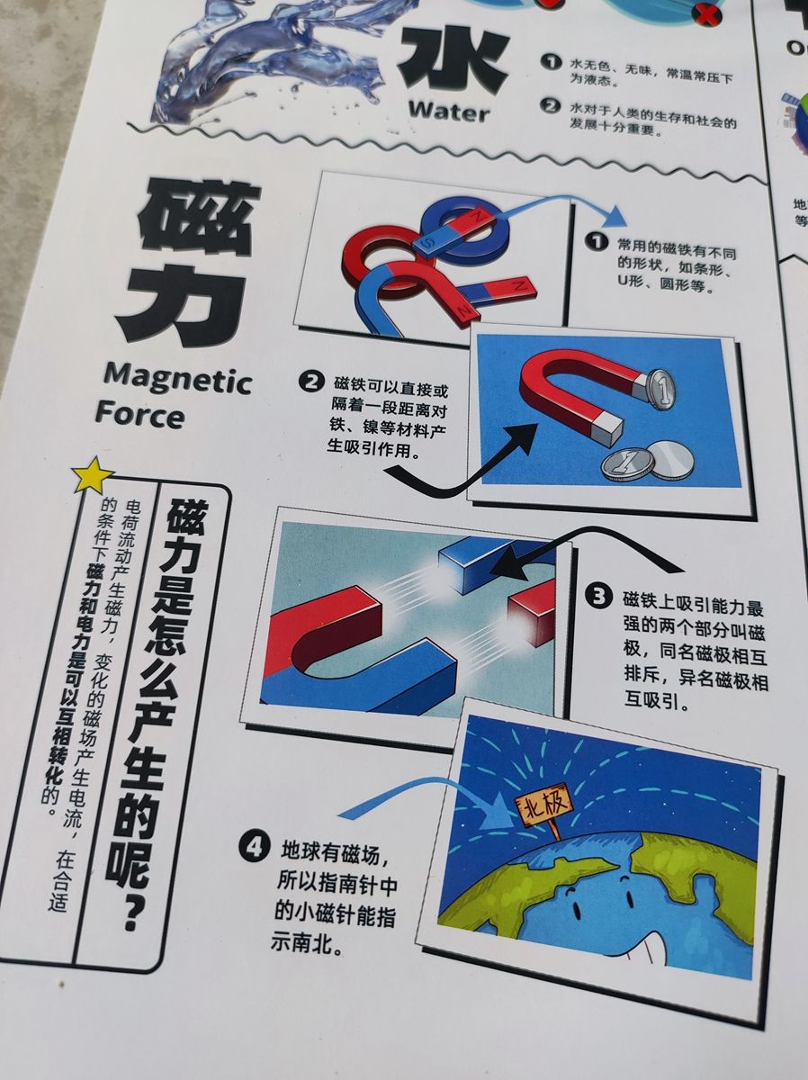 比如关于磁力现象,在故事的开始,先用有趣的故事来吸引孩子对磁力现象建立认知,然后通过图文演示来让孩子了解磁力的特性。