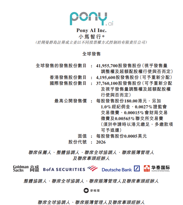 同日,小马智行在港交所公告,在港上市拟发行4195.57万股发售股份(视乎发售量调整权及超额配股权行使与否而定)。除非另行公告,发售价将不超过每股发售股份180港元。预期股票将于11月6日在港交所开始交易。