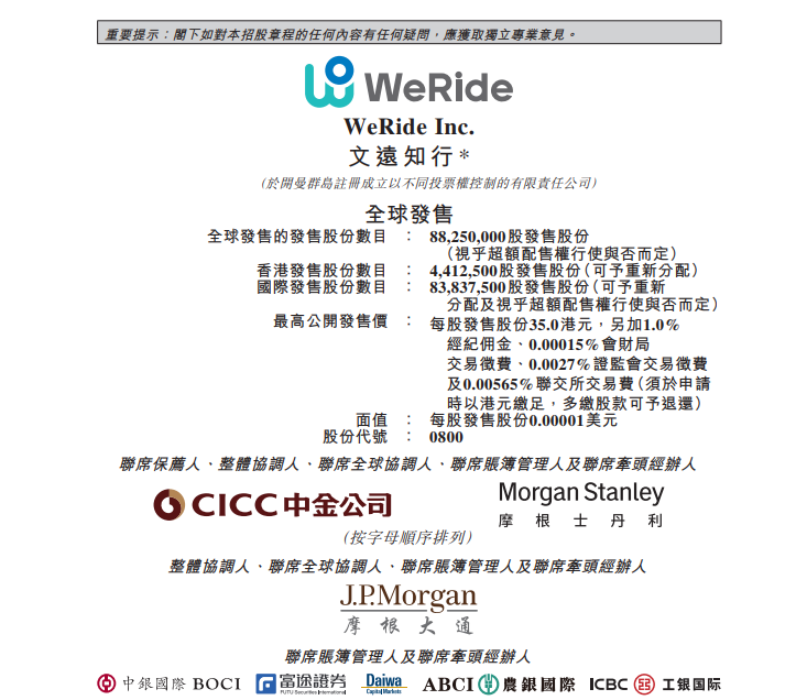 10月28日,文远知行在港交所公告,拟发行8825万股股份(视超额配售权行使与否而定),发售价不超每股35港元(除非另行公告),预期11月6日在港交所开始交易。