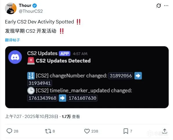 CS2博主Thour发文称今早SteamDB上CS2出现了新的开发活动