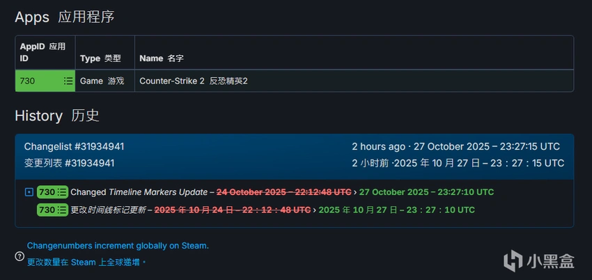 在SteamDB上CS2的历史更新记录页面可以看到列表发生了变化