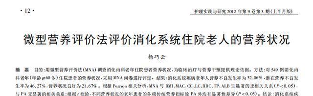 [1]杨巧云.微型营养评价法评价消化系统住院老人的营养状况,护理实践与研究,2012-02-05