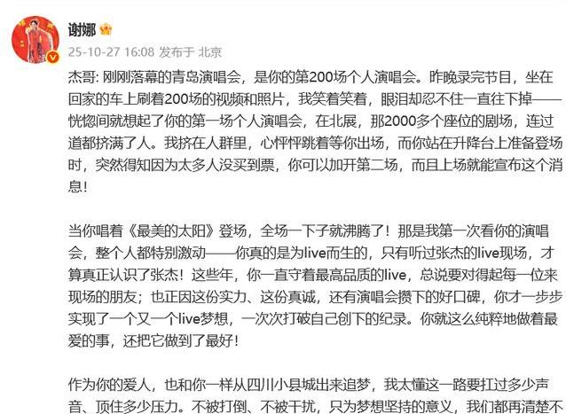 再说回谢娜。她在文里提到,她和张杰都是从四川小县城走出来的。两个年轻人,怀揣着梦想,来到大城市打拼。外面的声音多,压力也不小,但张杰从没被这些干扰过。他只想把歌唱好,把舞台做好。谢娜说,她最佩服张杰的,就是这份纯粹。200场演唱会,不是终点,而是新起点。张杰工作室也在当天发文,喊出了“1000场”的目标,够大胆,也够有底气。