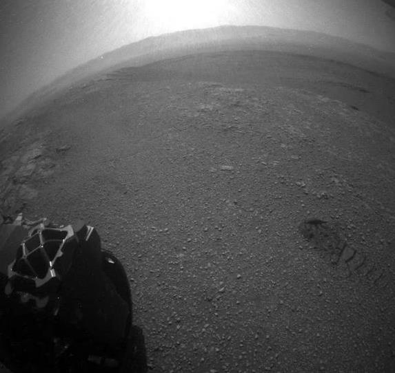 接着,“好奇号”又用后避险相机拍了两张黑白照片。这回镜头对准了落日的方向。火星的太阳慢慢往下沉,地上全是碎石头,车轮印清清楚楚,像是在说:“我来过这儿!”夕阳下的火星,多了点温暖的感觉,但还是透着一股子孤寂。这样的画面,咋看咋不像地球,总让人想多看两眼。