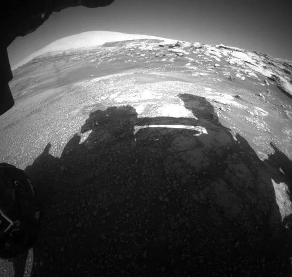 这次“好奇号”拍的新照片,来自它身上的四个相机。先说前避险相机,拍了两张黑白照片,画面里全是火星的“怪模样”。光秃秃的地面被阳光照得发亮,远处是高低不平的山,近处是坑坑洼洼的石头,孤单的车影拖在后面,看着有点冷清。这些照片让人感觉,火星就像个没人住的大荒漠,安静得让人心里发毛。