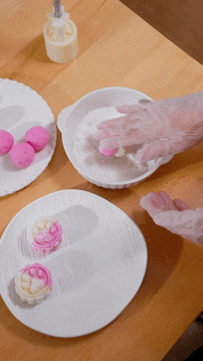 1个小球20克,你们就按照这个比例团好了,再两两搭配到一起。要是不打算做混色的就更简单了,直接团40克的山药球就妥了。