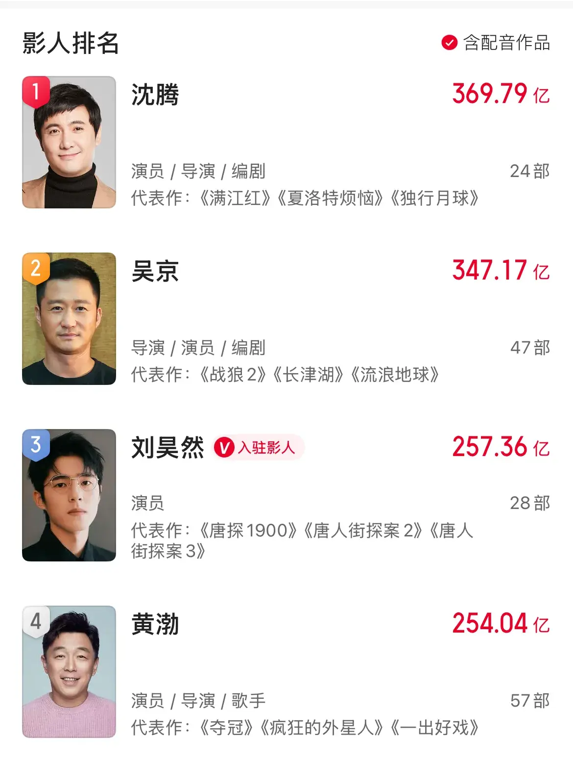 不过这两年,电影市场的风向悄悄变了。随着主旋律作品热度有所减退,吴京的“票房第一人”宝座也没能稳住。如今,他已经退居第二,而且跟榜首的沈腾之间,差距拉得有点大——大到有点“望尘莫及”的意思了。