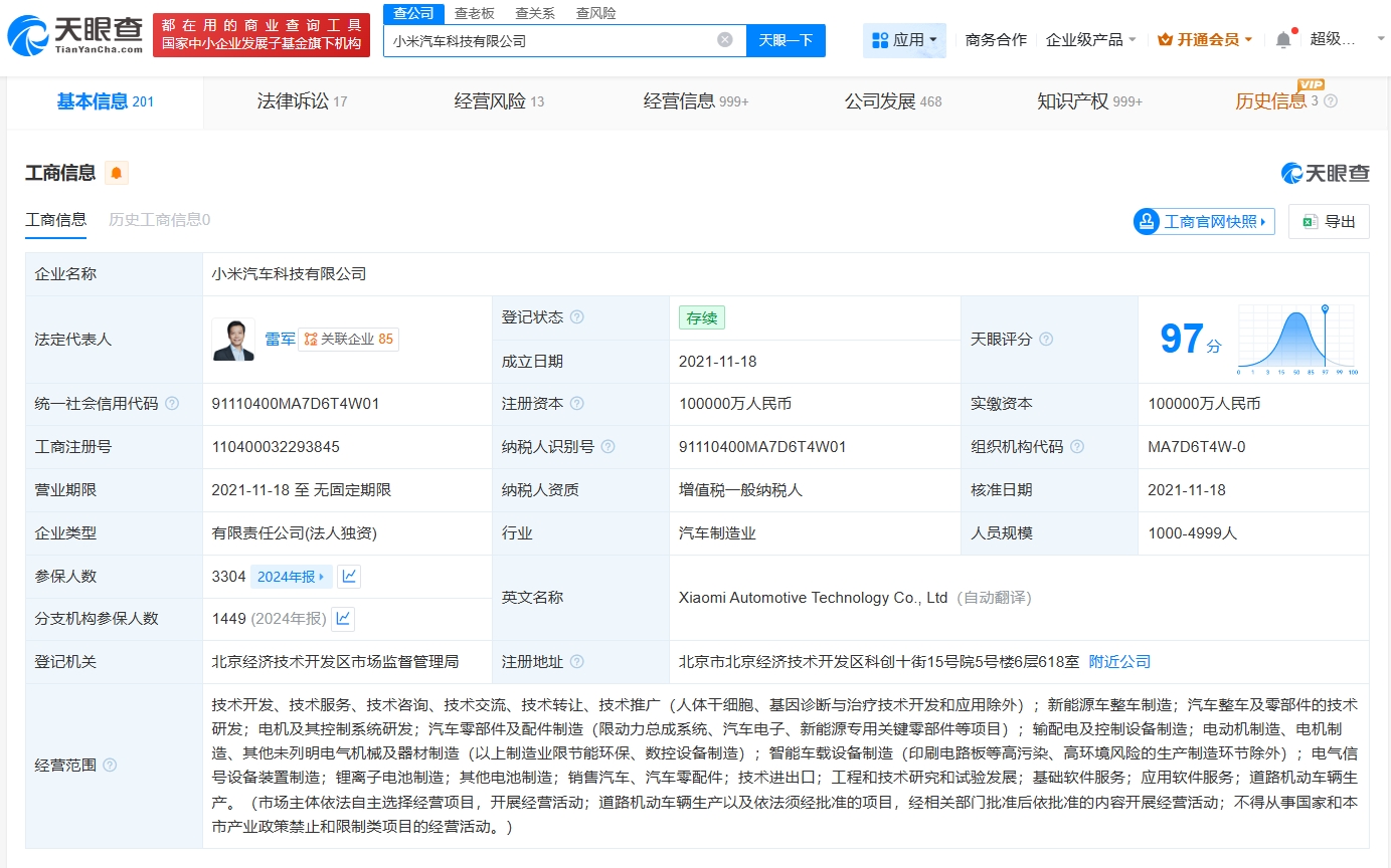 该公司成立于2021年11月,法定代表人为雷军,注册资本10亿人民币,经营范围包括新能源车整车制造、汽车整车及零部件的技术研发、电机及其控制系统研发等,由小米科技有限责任公司全资持股。