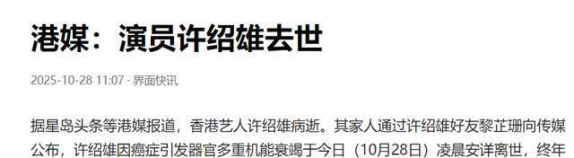 许绍雄的家人通过好友黎芷珊向传媒公布,许绍雄因癌症引发器官多重机能衰竭于10月28日凌晨安详离世。