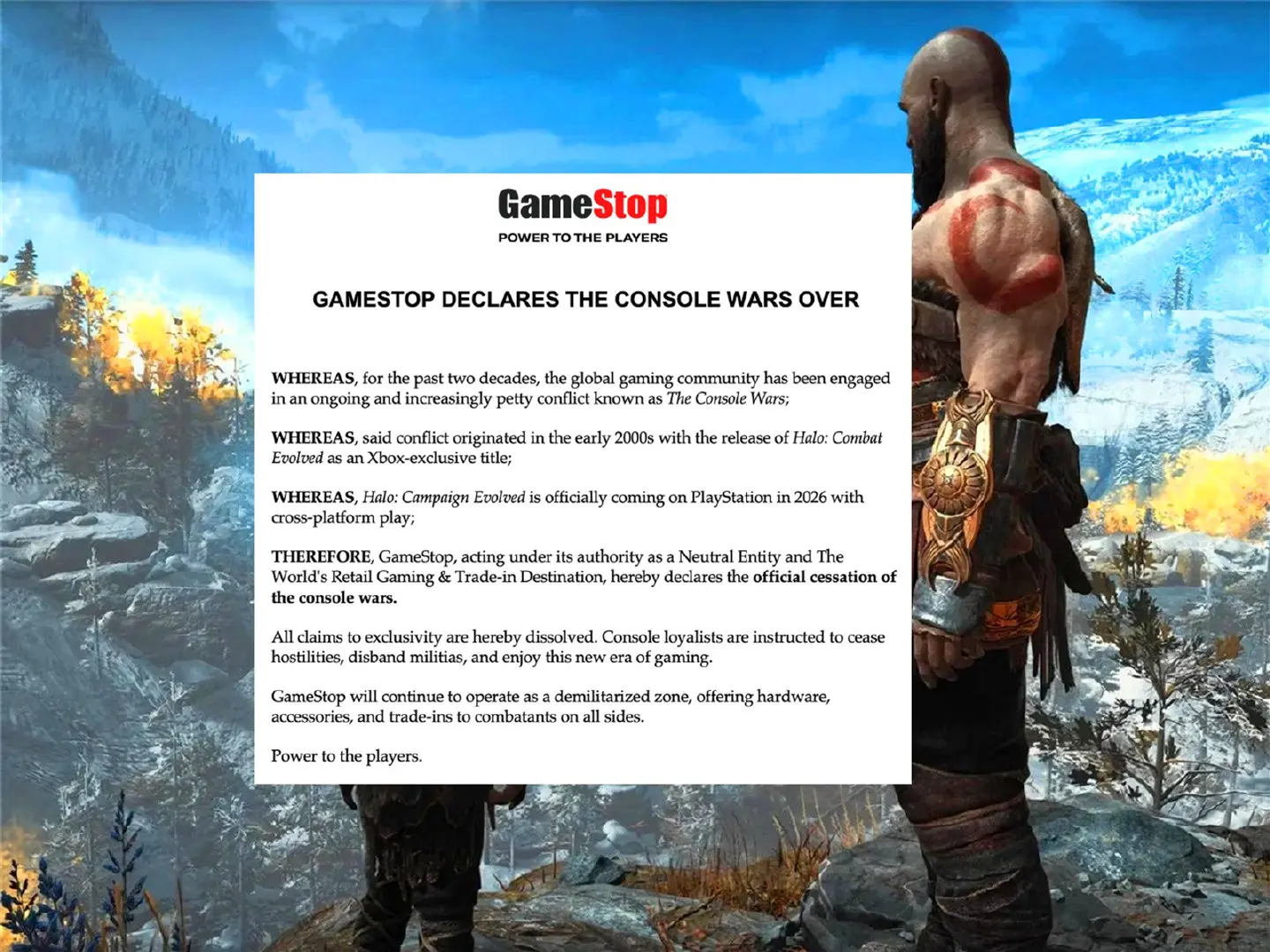GameStop近期一则幽默公告把“主机大战”这个吵了二十多年的话题重新拉回大众视野,这家老牌游戏零售商宣布,随着微软《光环:战斗进化》重制版确定2026年登陆PlayStation平台并支持跨平台连线,持续二十余年的主机论战该正式结束了,而它自己则是中立区,继续给所有阵营的玩家供货。虽然明眼人都知道这是博君一笑的营销噱头,但细想之下,却精准戳中了当下游戏行业的真实变局。