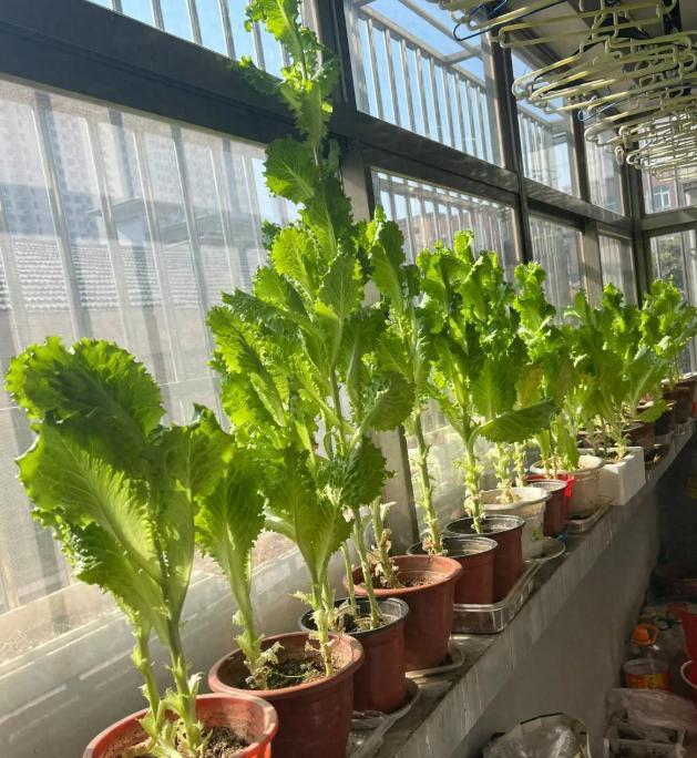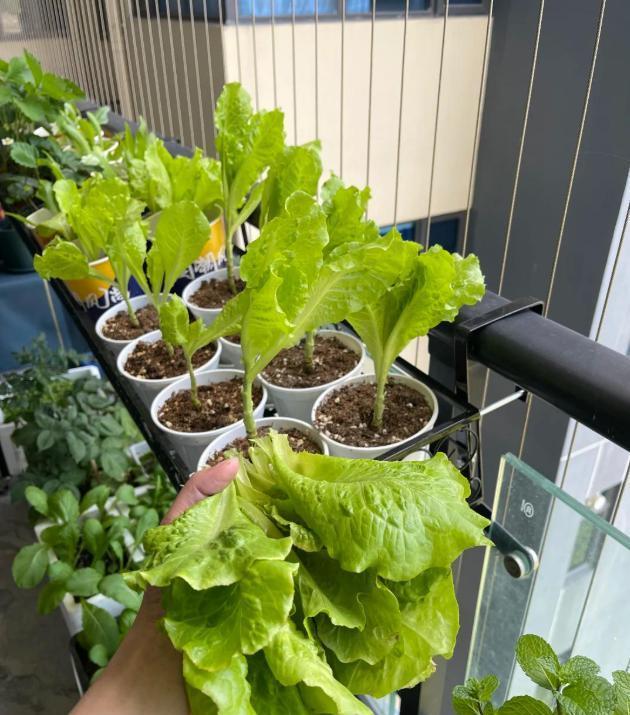 她租的房子光照条件一般,之前养花总养不活,后来干脆用闲置花盆和土试着种生菜,没想到长得特别旺。
