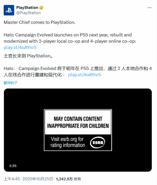 索尼官方发文 宣布“士官长来到 PlayStation”的推文,曝光量超过1240万次。