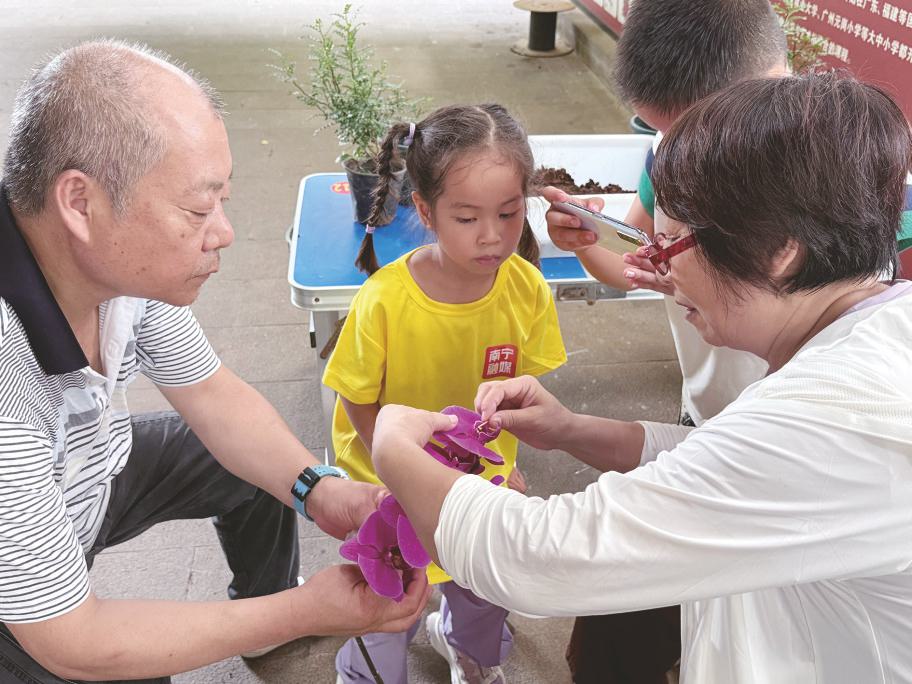 实践环节将活动推向高潮。在人工授粉体验中,孩子们手持棉签,小心翼翼地蘸取蝴蝶兰雄蕊的花粉,轻轻点在雌蕊柱头上,初次扮演“小蜜蜂”的角色让他们兴奋不已。随后的绿植栽种环节更显温馨,亲子分工协作——松土、选苗、定植、铺石,每一步都做得专注而细致。有的家庭轻声讨论如何让绿植更稳固,有的家长用手机记录下孩子专注的神情,种植现场洋溢着浓浓的亲情与合作的乐趣。