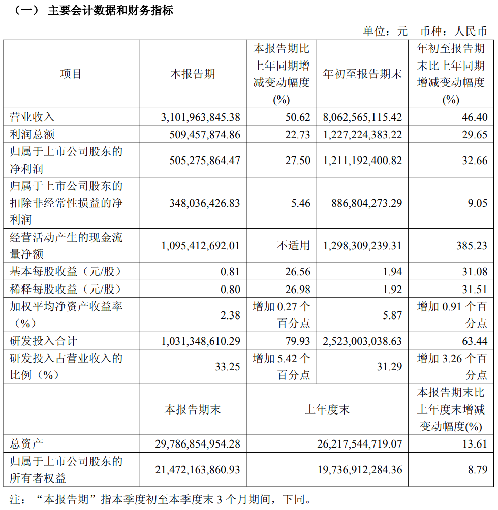 其中第三季度营收为31.02亿元,同比增长50.62%;归母净利润为5.05亿元,同比增长27.50%。