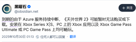 《天外世界2》本应在Xbox Game Pass上线,此时Obsidian官方Bluesky账号确认了服务器宕机及其对游戏发布的影响。在帖子中,开发商确认他们正在与微软合作解决问题。