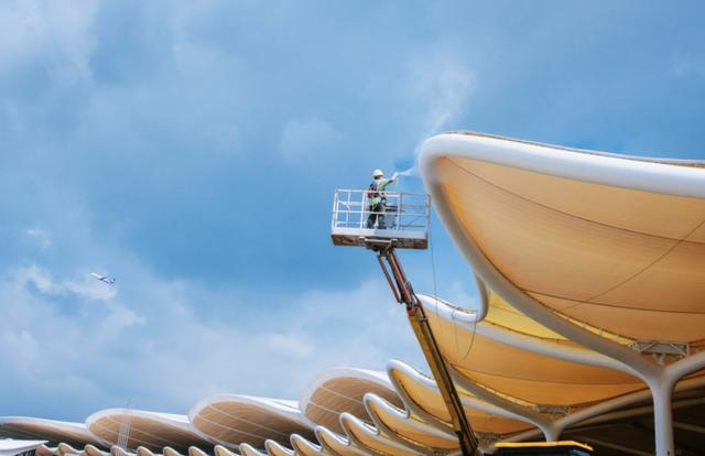 T3航站楼的“羊城花冠”造型里,藏满了灵动的绿建巧思。7.2万平方米玻璃幕墙搭配超5千平方米天窗,像铺开一层天然透光幕,既能滤去强光直射的燥热,又让晨光温柔洒满室内,省下大量照明能耗。70%的绿色建材实打实筑牢根基,兼具保温、防水、降噪功能的金属屋面,再适配广州气候做足细节设计,让航站楼冬暖夏凉,后期运维也更省心节能。