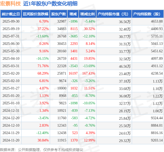 从股价来看,2025年9月19日至2025年9月30日,宏景科技区间涨幅为6.7%,在此期间股东户数减少1896.0户,减幅为5.44%。