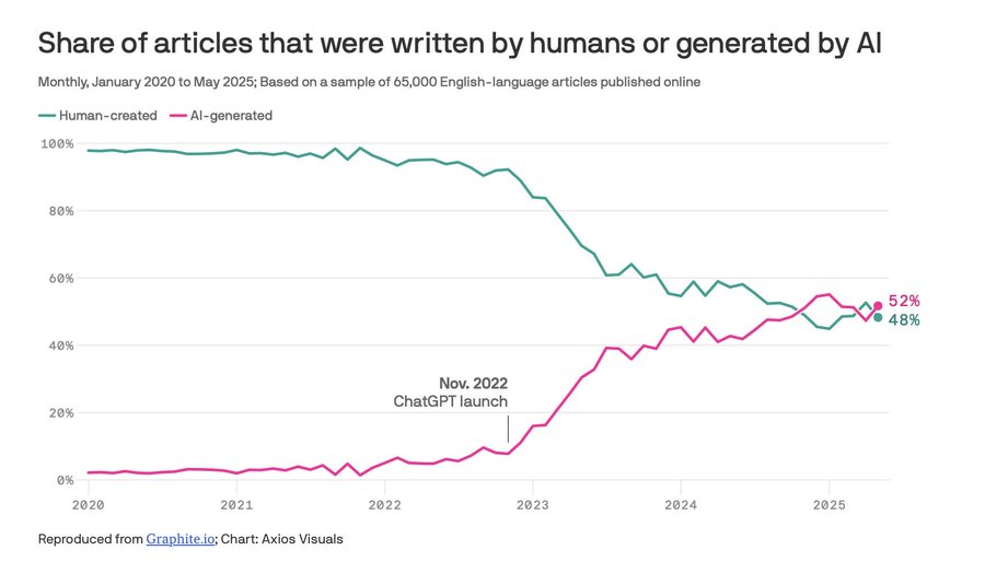 牛津大学研究显示,互联网中AI生成内容已过半。(图/《More Articles Are Now Created by AI Than Humans》)