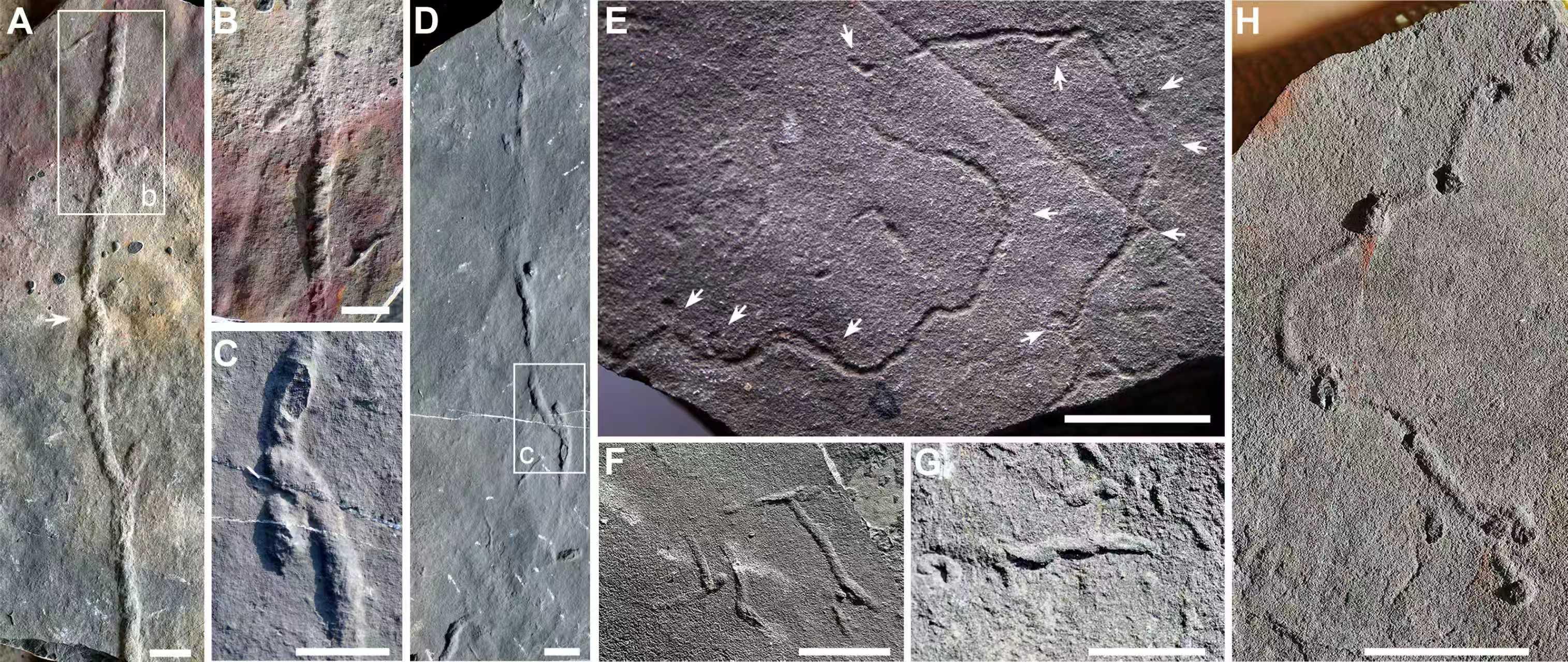 据南京古生物所研究员陈哲介绍,在对湖北宜昌“石板滩生物群”(距今约5.5亿—5.43亿年)遗迹化石的研究中,他们发现锯形迹属中的多个遗迹化石种,并建立一个新遗迹化石种。锯形迹被视为动物首次向沉积物内部进行“三维探索”的标志性遗迹,具有重要的演化生物学、动物行为学和生态学意义。与此同时,石板滩生物群中还保存了多山迹及蝌蚪状遗迹化石等三维潜穴。