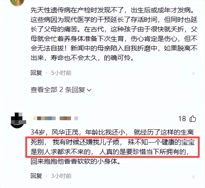还有人感慨,风华正茂的年纪,经历生离死别真的很难释怀,联想到自己身上,才发觉一个健康的宝宝有多重要,孩子再调皮,都能原谅了。