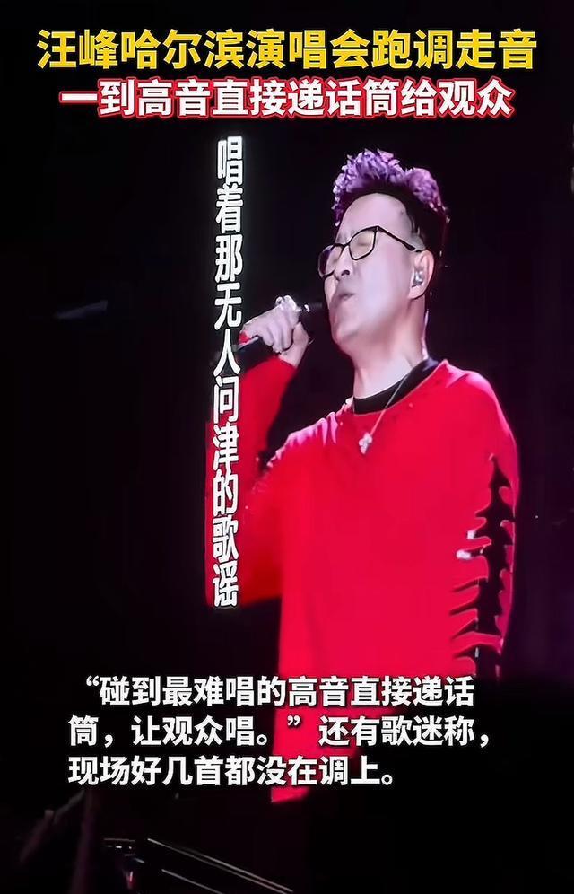 汪峰已经不行了,哈尔滨演唱会啊,跑调走音全占了。说年轻的时候写歌没轻没重,到了现在啊,自己的歌儿自己都唱不了,一到高音就跑调,甚至后面的高音几乎只交给观众唱。不过,你说他这种撕裂唱法让林子祥来唱,那不是轻轻松松拿捏?你说,汪峰怎么就成了?他这些功夫都跑哪儿去了?