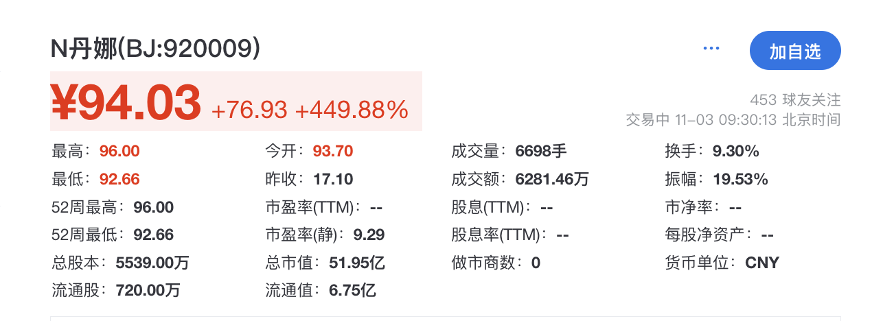 瑞财经 刘治颖 11月3日,丹娜生物(920009.BJ)在北交所挂牌上市,保荐机构为招商证券,开盘涨449.88%,总市值51.95亿元。