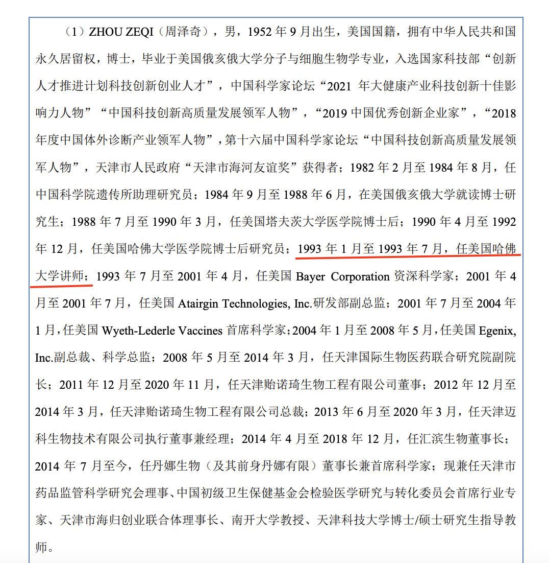 公开资料显示,ZHOU ZEQI(周泽奇),男,1952年9月出生,美国国籍,拥有中华人民共和国永久居留权,博士,毕业于美国俄亥俄大学分子与细胞生物学专业;1982年2月至1984年8月,任中国科学院遗传所助理研究员;1984年9月至1988年6月,在美国俄亥俄大学就读博士研究生;1988年7月至1990年3月,任美国塔夫茨大学医学院博士后;1990年4月至1992年12月,任美国哈佛大学医学院博士后研究员;1993年1月至1993年7月,任美国哈佛大学讲师。