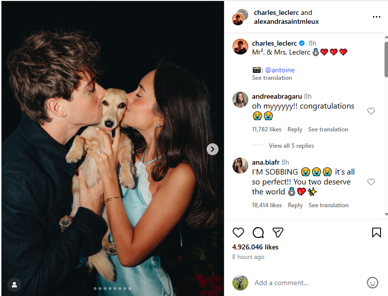 法拉利F1车队现役车手乐扣官宣订婚!全网祝福